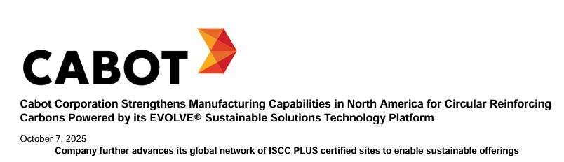 卡博特公司于10月7日宣布,已依托其 EVOLVE® 可持续解决方案技术平台,强化北美地区循环补强炭黑的生产能力。随着这一里程碑的达成,美国路易斯安那州维尔普拉特生产基地正式加入巴西毛阿、捷克共和国瓦拉什斯凯梅济日奇(瓦勒梅日奇)生产基地的行列,共同具备经验证的循环补强炭黑生产能力。该循环补强炭黑采用源自废旧轮胎的轮胎热解油为原料,并遵循国际可持续发展与碳认证(International Sustainability & Carbon Certification,ISCC)PLUS 质量平衡方法生产。此外,卡博特已将其全球 ISCC PLUS 认证生产基地网络拓展至 14 家工厂,在提升经认证可持续解决方案供应能力的同时,进一步推进公司对循环型可持续经济的承诺。